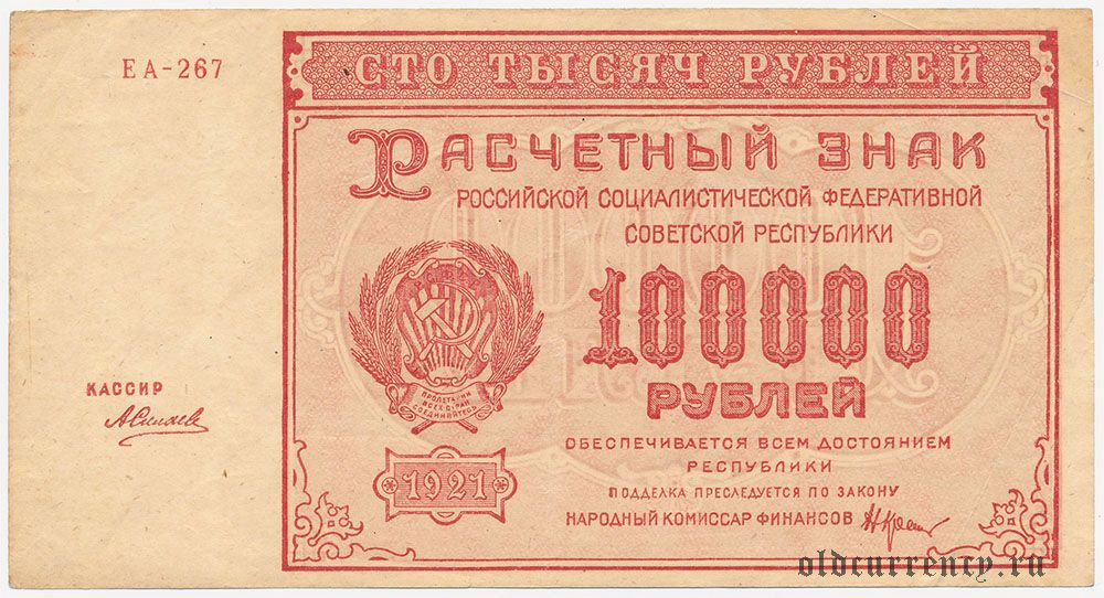 100.000 рублей 1921 года. Кассир: А.Селлява