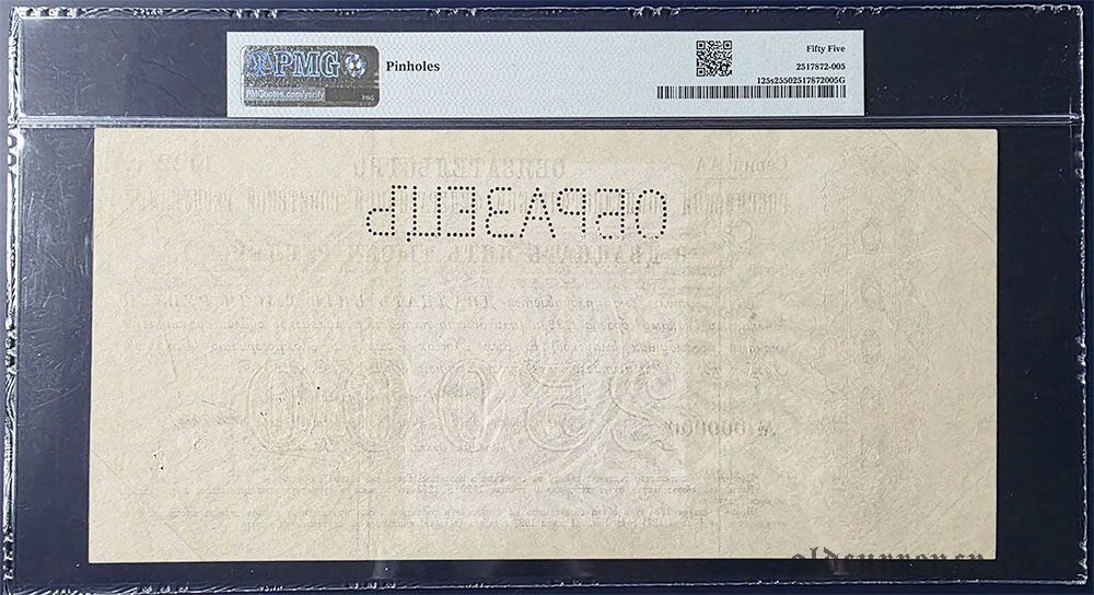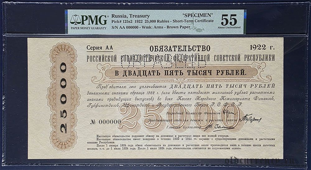 Обязательство, 25.000 рублей 1922 года. Образец. В слабе PMG
