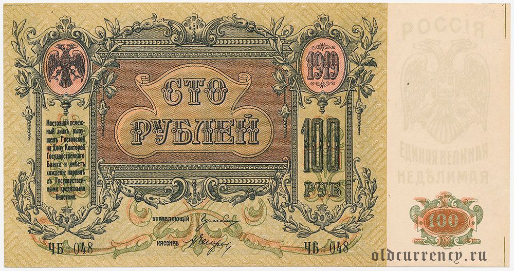 Ростов-на-Дону, 100 рублей 1919 года. Серия: ЧБ-048