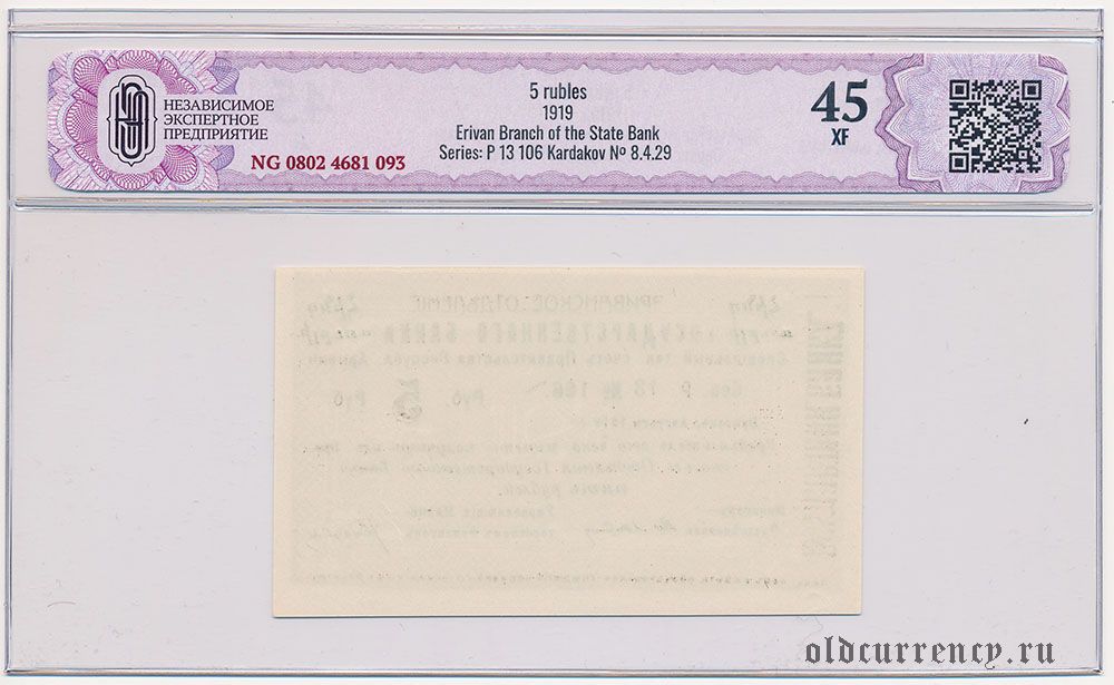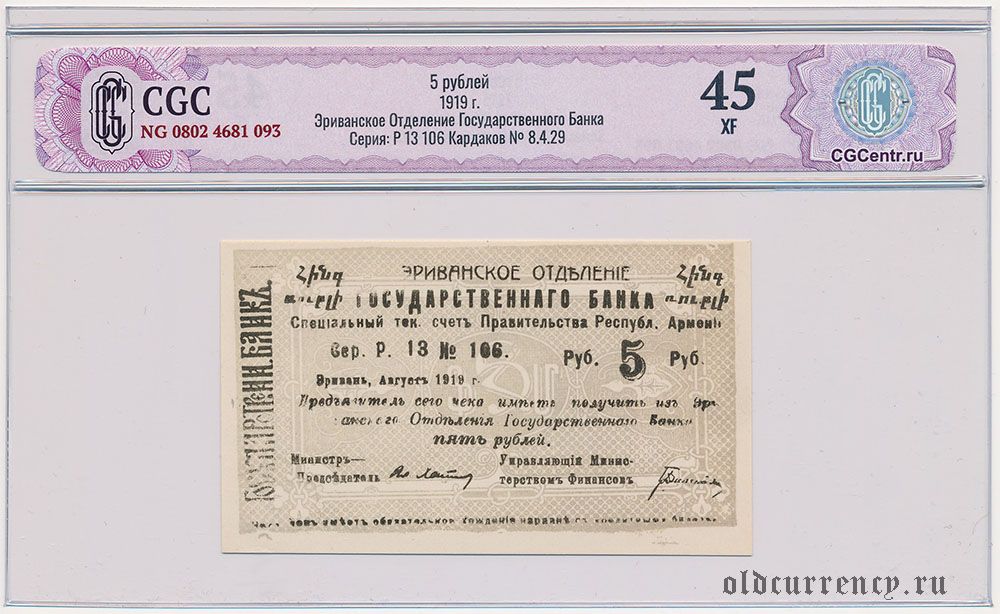 Армения, Эриванское отделение, 5 рублей 1919 года. Сер. Р. 13. В слабе CGC