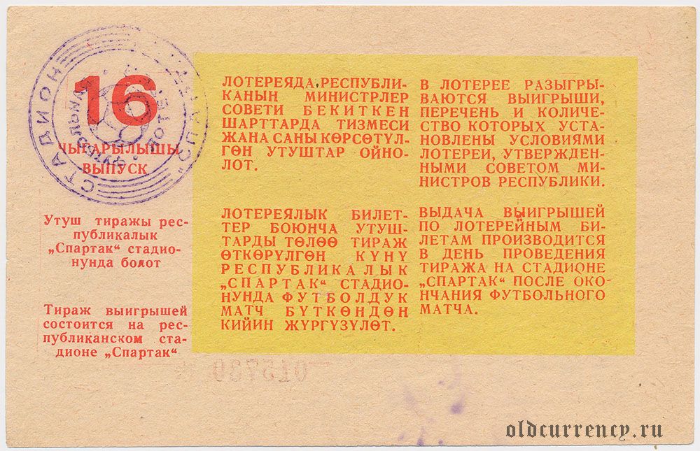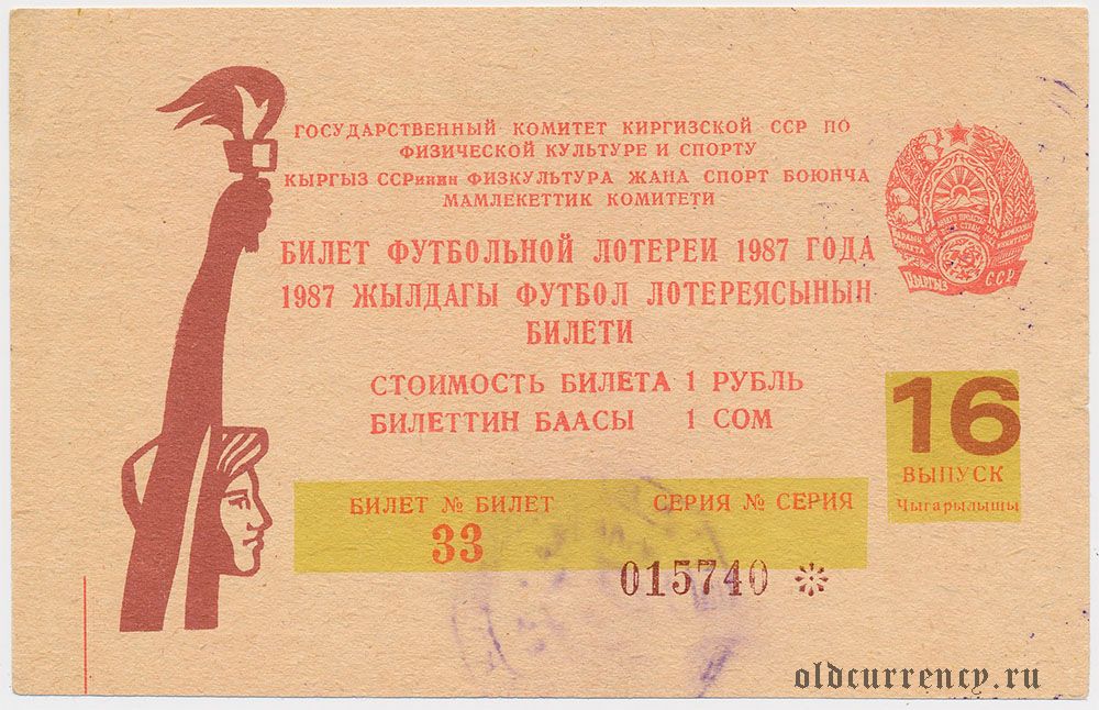 Киргизская ССР, комитет по физкультуре и спорту, футбольная лотерея 1987 года, 16 выпуск
