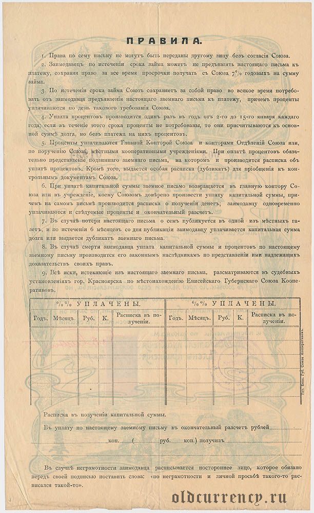 Енисейский Губернский Союз Кооперативов, заемное письмо, 50 рублей