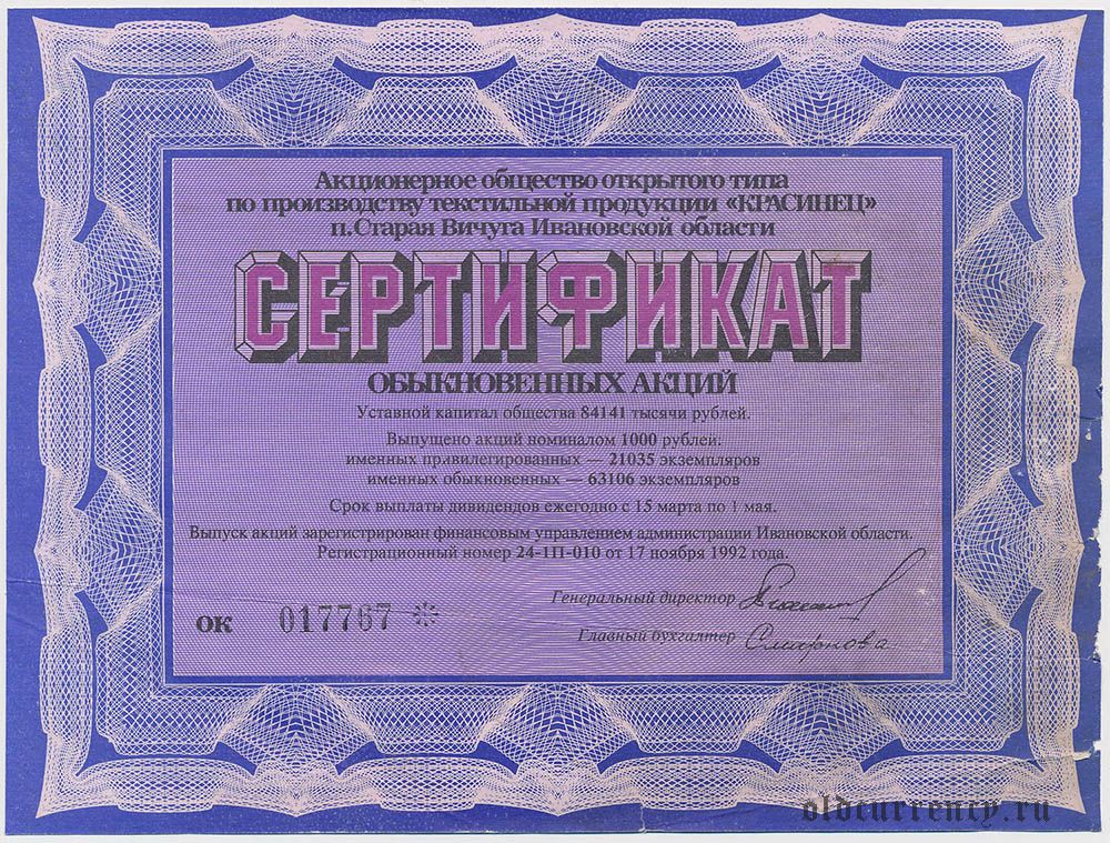 Старая Вичуга, "Красинец", сертификат акций 1992 года