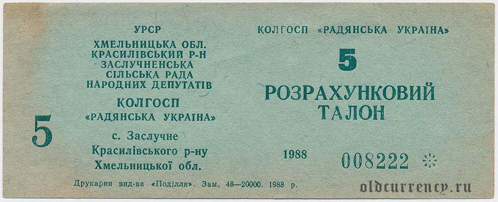 Заслучное, Колгосп "Радянська Україна", 5 (рублей) 1988 года