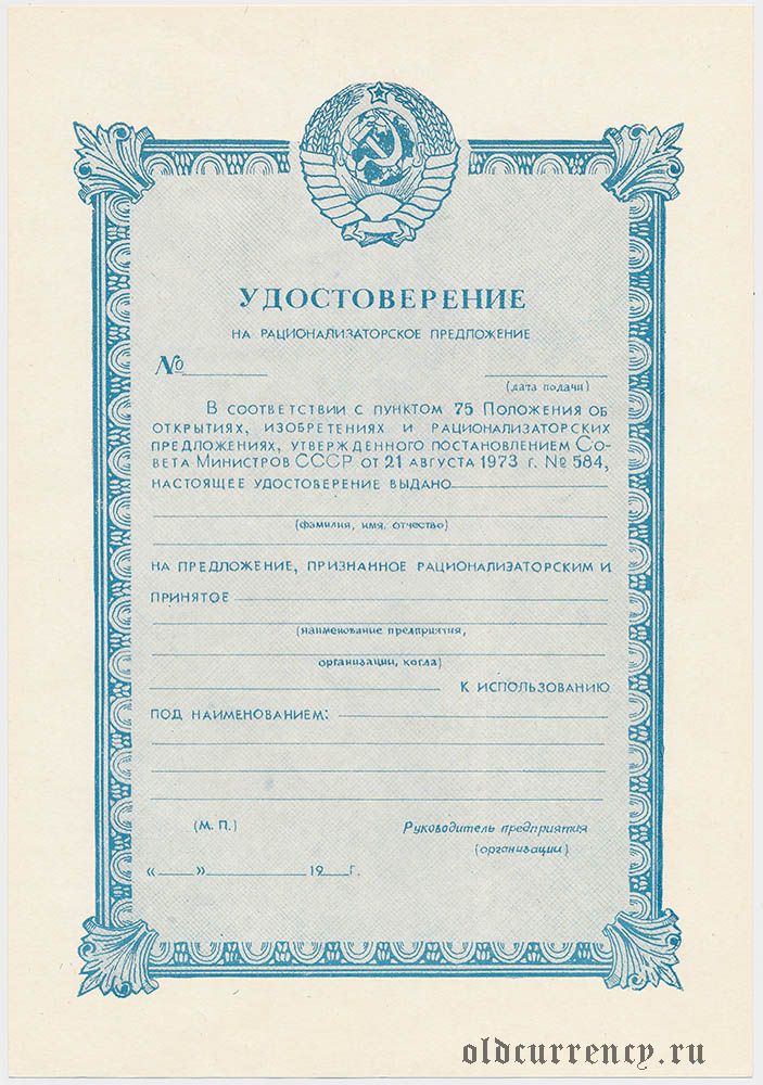 Удостоверение на рационализаторское предложение