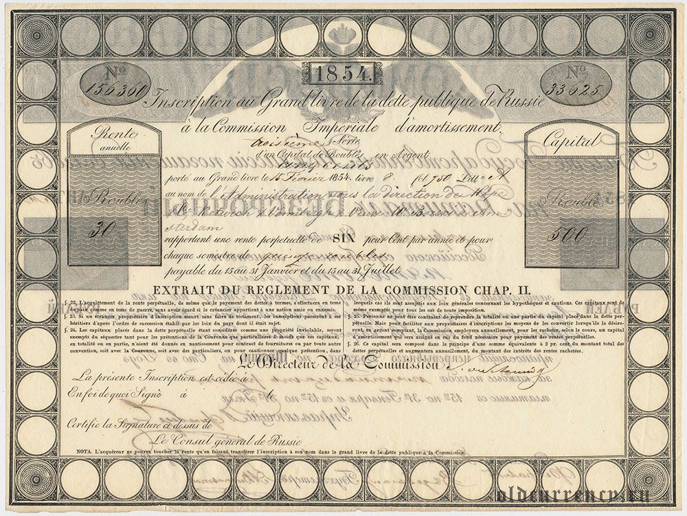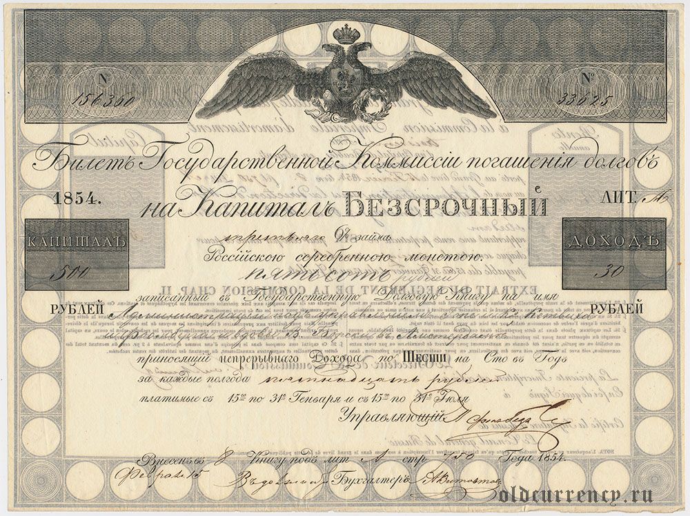 Билет Коммиссии погашения долгов, 500 рублей 1854 года