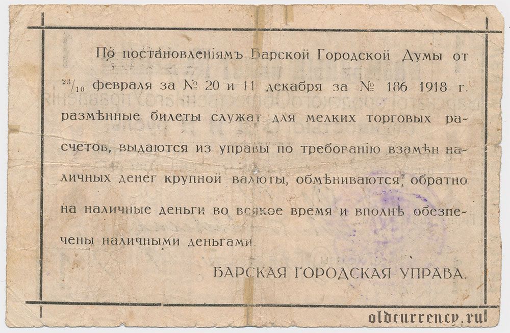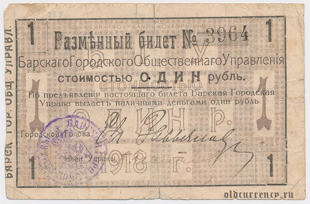 Бар, Городское общественное управление, 1 рубль 1918 г. 2-я серия