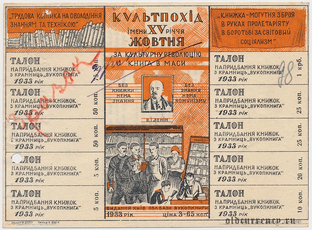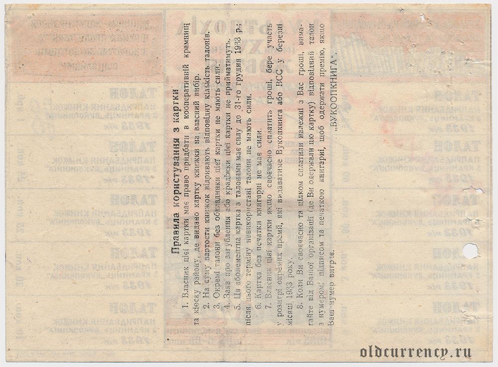 Киев, "Вукоопкнига", абонементная карточка с талонами, 1933 года