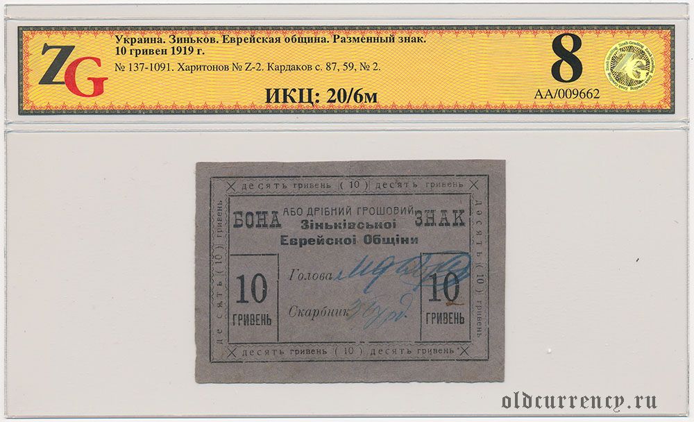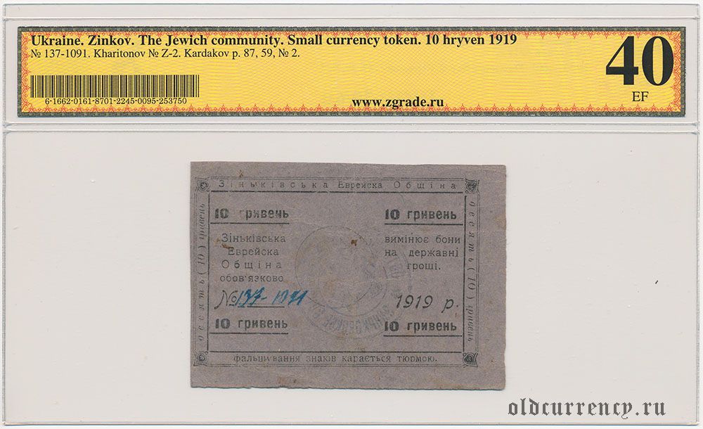 Зиньков, Еврейская община, 10 гривен 1919 года. В слабе ZG