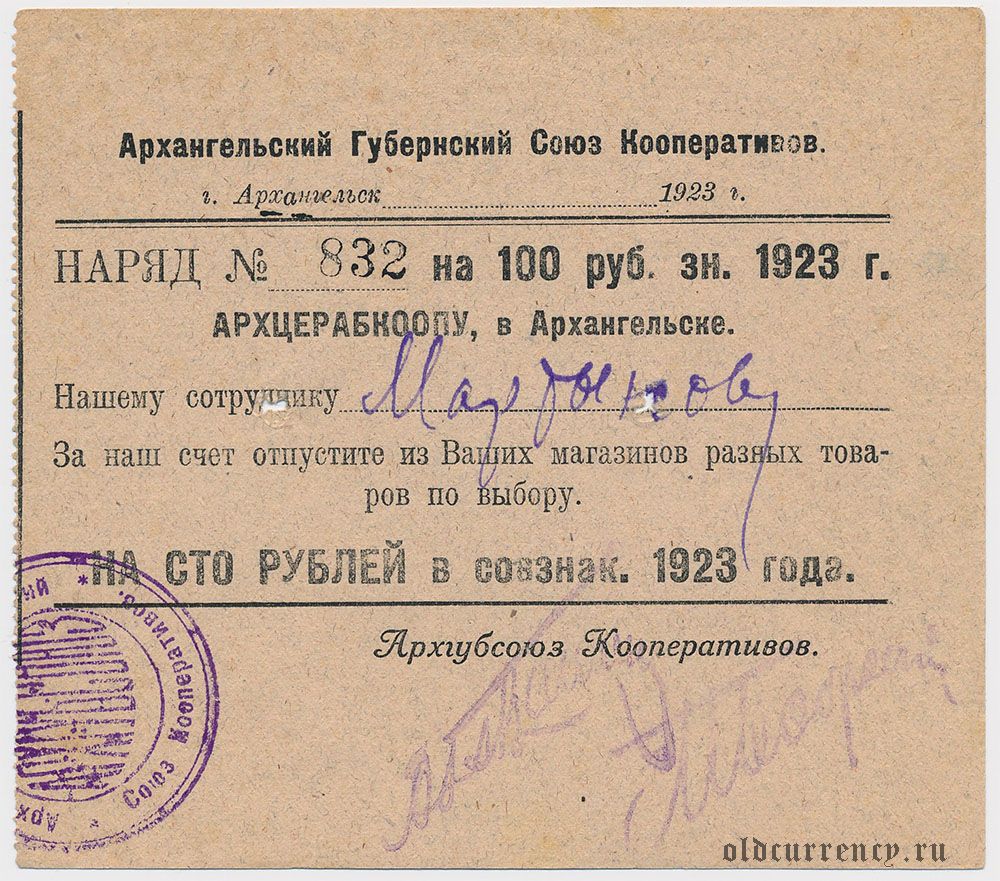 Архангельск, губернский союз кооперативов, 100 рублей 1923 года