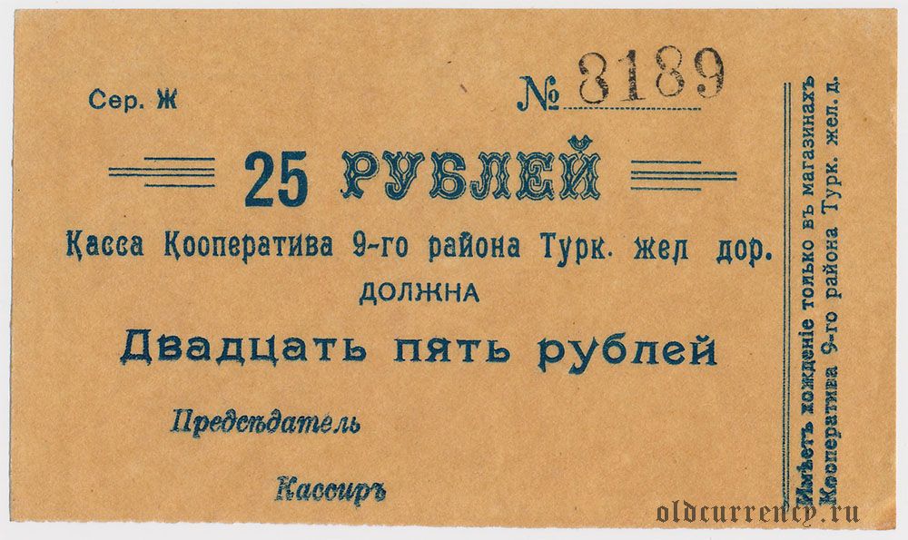 Коканд, Касса Кооператива 9-го р-на Туркестанской ж.д., 25 рублей