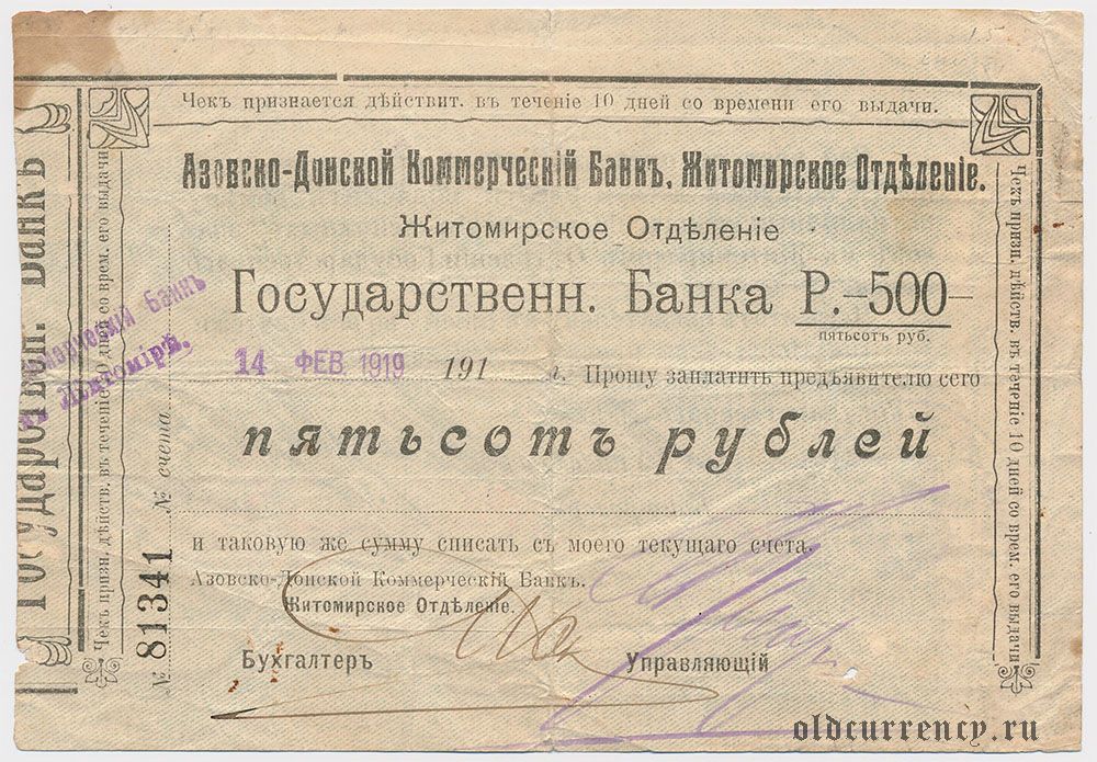 Житомир, Азовско-Донской Банк, 500 рублей 1919 года