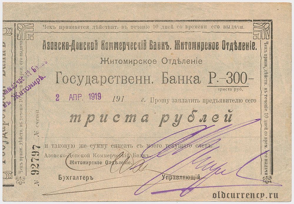 Житомир, Азовско-Донской Банк, 300 рублей 02.04.1919 года