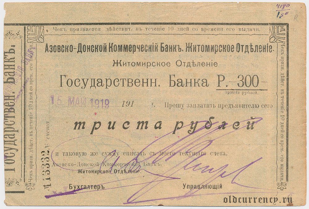 Житомир, Азовско-Донской Банк, 300 рублей 15.05.1919 года