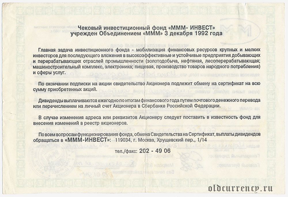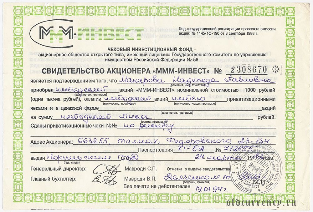 МММ-ИНВЕСТ, Свидетельство акционера 1993 года