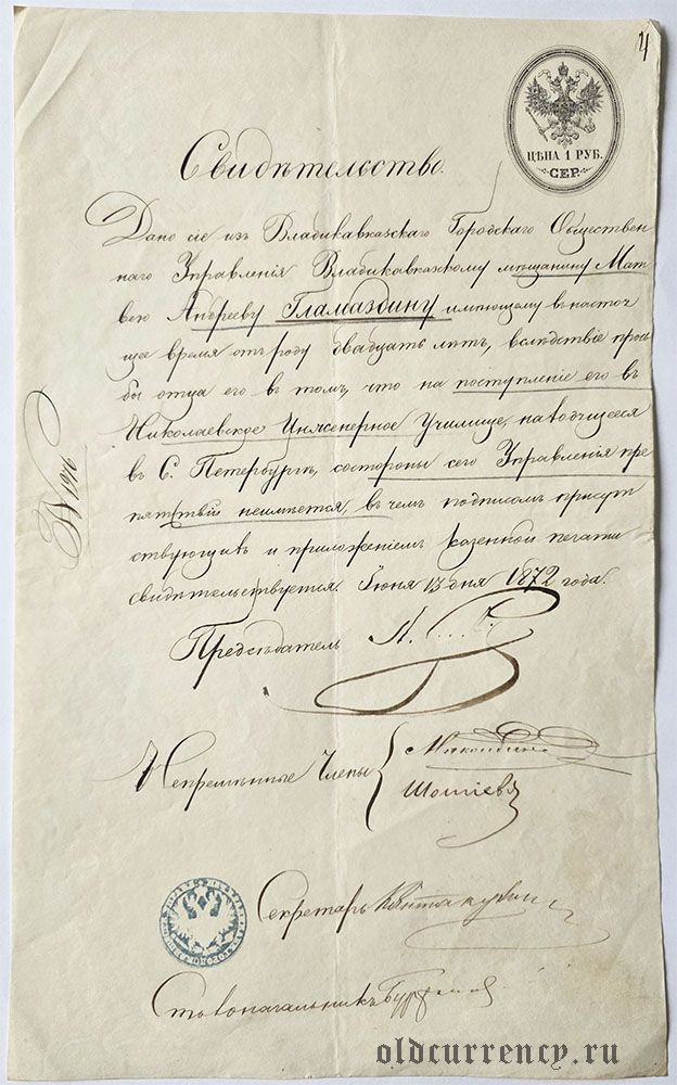 Свидетельство 1872 года на гербовой бумаге 1 рубль