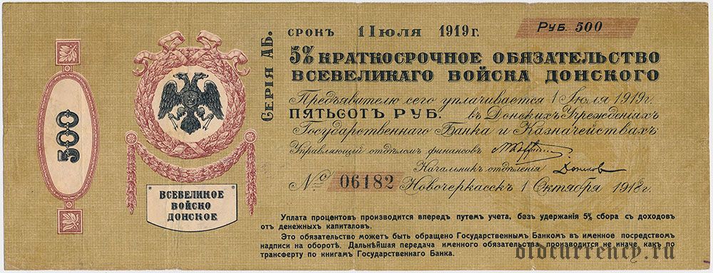 Всевеликое Войско Донское, Таганрог, 500 рублей, Июль 1918 года