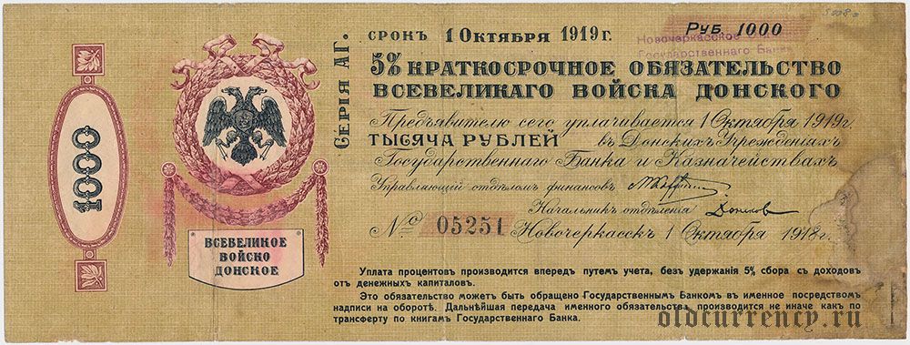 Всевеликое Войско Донское, Новочеркасск, 1000 руб., Октябрь 1918 года