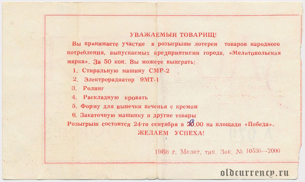 Мелитополь, "Мелитопольская марка", лотерея 1988 года
