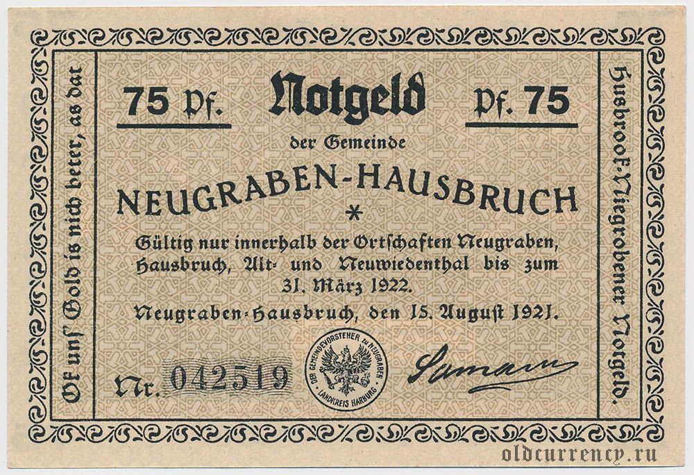 Нойграбен - Хаусбрух (Neugraben-Hausbruch), 75 пфеннингов 1921 года