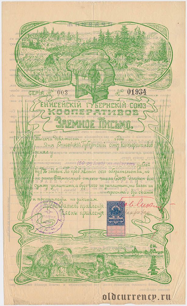 Енисейский Губернский Союз Кооперативов, заемное письмо, 50 рублей