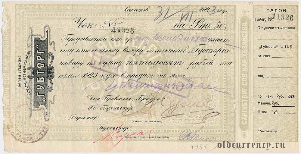 Саратов, ''Губторг'', 50 рублей. С талоном