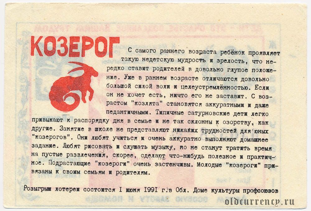 Псков, Международный день защиты детей, лотерея 1991 года, "Козерог"