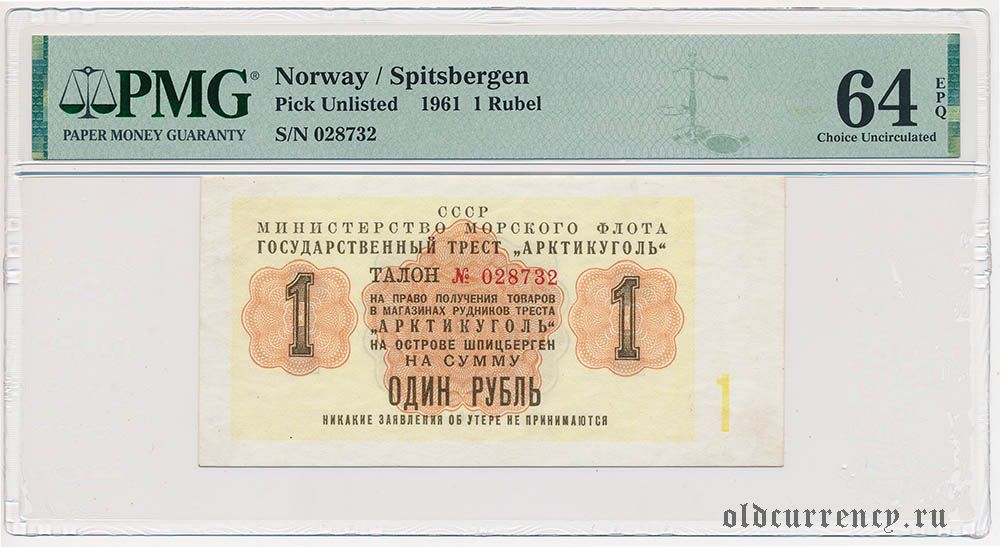 Шпицберген, "Арктикуголь", 1 рубль 1961 года. В слабе PMG