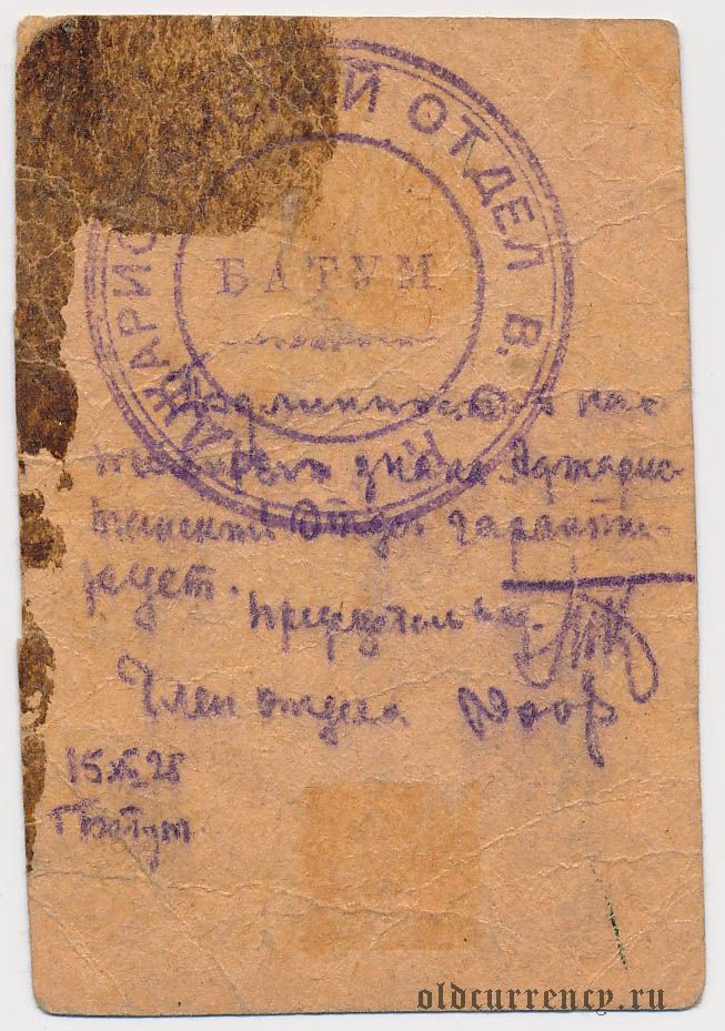 на Рв подтверждение подлинности знака, заверенное печатью Аджаристанского отдела В.О.К.